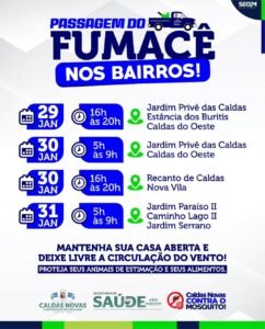 A população também pode acompanhar a programação dos carros do fumacê pelo portal do Governo de Caldas Novas, no endereço eletrônico www.caldasnovas.gov.br e pelas redes sociais oficiais. Confira abaixo, o cronograma desta semana: